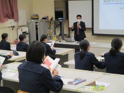 2月1日(水)、北九州市立大学国際環境工学部、環境デザイン学科の教授・福田展淳先生をお招きして、『建築デザインへの招待』というテーマで1時間の講座を実施していただきました。建築に興味のある生徒はもちろん、興味のある文系の生徒や進路を考えている1年生などで14名の生徒が参加しました。講座の内容は、建築がただ建物を作ったりデザインを考えたりするのではなく、環境への配慮やエネルギー(エコ)を考えた設計、街づくり、都市計画などを考慮している内容をお話しいただきました。建築一つにとって見ても、学校で学ぶ様々な分野が折り重なって社会に貢献していることを学ぶことができました。