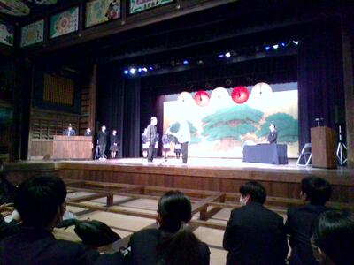 午後からは2年2組の丸山君のスライド発表が八千代座でありました。各学校地域の発展のためにこの1年間研究してきた内容を発表しました。丸山君は「行政アプリ」に関しての発表を行いました。最後に表彰が行われ、鹿本高校は「笑顔が太陽で賞」を受賞しました。今回の発表は、「和紅茶が山鹿市が初めて政府の認定を受けた」など初めてを聞くことが多く、生徒の考える幅が広がったように思えました。