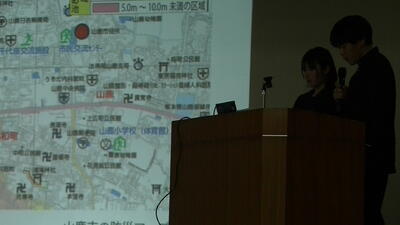自身の研究の説明をする中満さん 発表をする宇野さん(左)、高水間くん(右)
