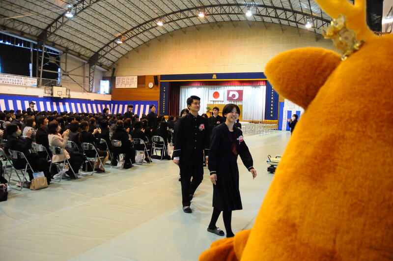 式では、先ず卒業証書授与があり、代表生徒が堂々とかつ清々しく証書を受け取りました。次に校長式辞では学年に対する学校長からの暖かいお言葉があり、教育委員会、来賓の方々からはお祝いの言葉とともに、これから社会へと巣立つ卒業生への指針をご教授いただきました。続けて先輩へ思いのあふれる送辞の後に、卒業生代表による答辞があり、参列者の涙を誘っていました。式歌斉唱では、新型コロナウイルス直撃世代として、「声をだすな」と指導され、歌うことのほとんどなかった卒業生や在校生が、歌詞を覚え、声を出し、期待に応えてくれた姿に目頭が熱くなりました。最後に森山直太朗「さくら」に合わせて退場しましたが、学校ゆるキャラ「しかモン」の見守る中、ちょうど曲の終わりとともに、何度も練習したかのように全員が退出するという、この学年らしい、偶然の予定調和で終わりました。「愛(試練、厳しさ、支え、励まし、思い、期待)に努力で応える」というのがこの学年の特徴でしたが、卒業生たちはそれに見合う振る舞いを見せてくれました。