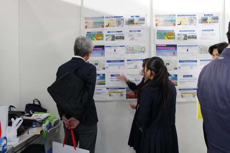また本校ブースにおいて、10月の「世界津波デー高校生サミット」に参加した生徒たちにより高潮の防災に関するプレゼンが行われ、本校ブースを訪れた訪問者の方々に積極的に説明を行っていました。