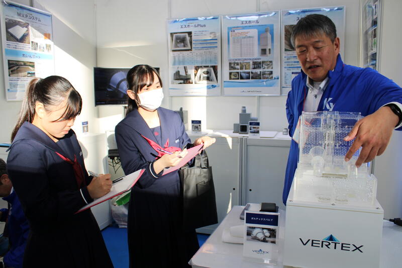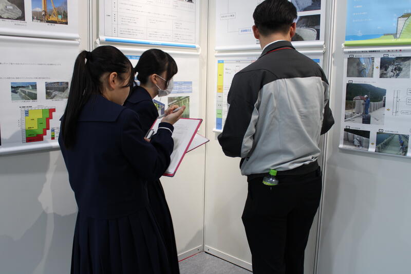この8名は、本校の課題研究YSPⅡで防災について研究をしており、全国から防災・減災の最新技術を持つ企業が集まるこの展示会で、研究へのヒントを得たりアドバイスをもらったりするために多くの企業ブースを訪れ、熱心に説明を受けていました。