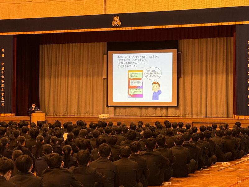期末考査2日目が終了後、全校生徒が体育館に集まり、熊本県警察本部からの闇バイトに対する講話を聞きました。