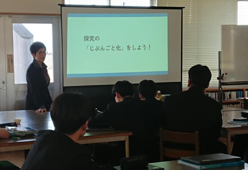 1年生は、2学期から初めての課題研究にグループで取り組み、研究を進めてきました。ただし、研究の方向性や調査方法等、手探りで進める中で悩みも出てきます。そこで今回の授業では、各グループの研究テーマについて、メンバー同士で語り合う場を設けていただきました。