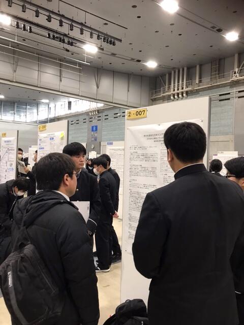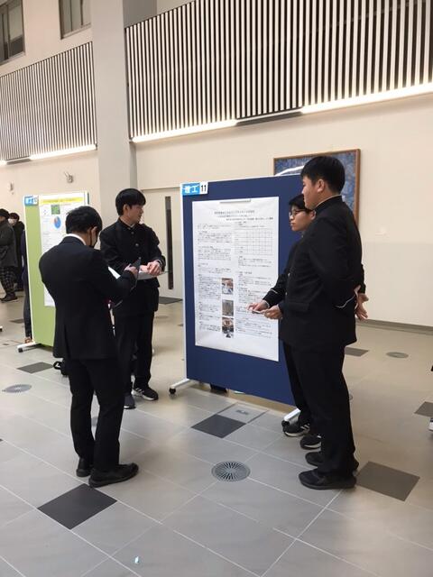 ポスター発表とは研究発表等において見られる発表形式で、自らの研究をA0の大きさのポスター1枚にまとめ、それを壁や衝立に掲示して、立ったまま参加者に説明をするというものです。今回は研究発表5分、質疑応答5分の計10分を1ターンとして、計3ターンを各発表者が行うという形式で行われました。本校から参加した3名は、カゼインプラスチックを柿渋で強化することができるのではないかという研究テーマに取り組んでおり、発表を聞かれた大学の先生方から多くのアドバイスをいただいていました。このように他の人(特に大学の先生など)の前で発表をするというのは、人間的にも、課題研究的にも大きく飛躍できる機会となります。研究自体はまだ拙いものですが、今回の発表でも質疑応答にしっかりと受け答えできており、自分たちで試行錯誤しながら取り組んできた成果を発揮していました。