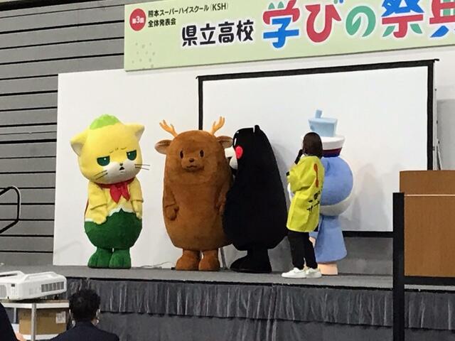 12月21日(土)、グランメッセ熊本で、「熊本スーパーハイスクール(KSH)県立学校『学びの祭典』」が開催されました。KSHとは、学校紹介あり、商品の販売あり、学校紹介あり、課題研究のポスター発表あり、歌あり、演奏あり、ダンスあり・・・と、県内の高校が日頃から取り組んでいる活動を発表する高校生の一大イベントです。本校からも2年生58名、1年生10名、そしてしかモンが参加しました。