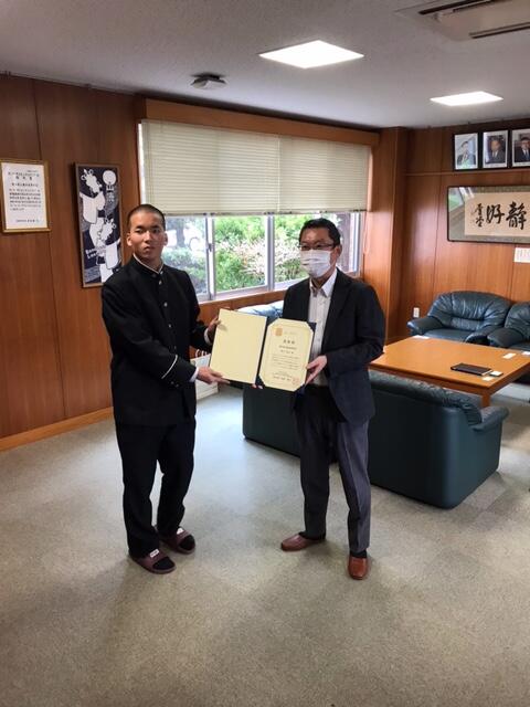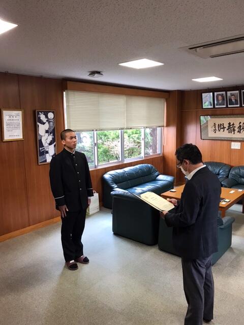 第12回高校生ビジネスプラングランプリのベスト100に本校2年生の野中奏音くんの作品が選ばれ、12月20日(金)に、主催の日本政策金融公庫より2名の方が来校され、校長室にて野中くんに直接表彰状を手渡されました。