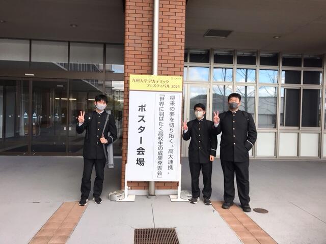 12月22日(日)に九州大学において「世界に羽ばたく高校生の成果発表会」が開催され、本校から2年3組の鹿子木くんと古川くん、2年5組の南木くんの3名が参加し、「柿渋を混ぜたカゼインプラスチックの研究」というテーマでポスター発表を行いました。このイベントは、九州大学が行う高大連携の一環として行われており、九州一円から61テーマ約400名の生徒が参加し、人文、理工、生物、複合の4つのテーマに分かれて発表を行いました。
