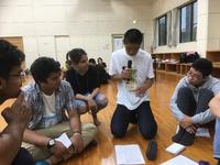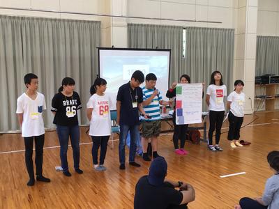 イングリッシュ・キャンプ初日の午後は、午前中に見られた緊張も解け、生徒は私服に着替え、活動開始!留学生リーダーの自己紹介や母国の話を聞き、その内容をポスターにまとめ、みんなに発表する活動を行ないました。生徒は役割を分担して発表をし、少しずつアウトプットする積極的な姿勢が見られました。