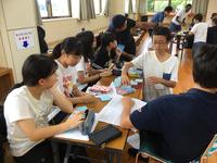次は、英語探究で準備した『日本の文化、高校生活、熊本県』についての情報を留学生リーダーに伝える活動。生徒は留学生からの質問に笑顔で答え、留学生との距離が縮まりました。そして、10年後の日本をイメージし、その姿を旗として表現し、発表する活動と続きました。オリジナリティ溢れる旗が出来上がり、原稿なしで話す姿勢が印象的でした。生徒たちはすぐにリーダーと打ち解け、リーダーの話を真剣に聞き入りながら、英語でのやりとりにチャレンジしていました。