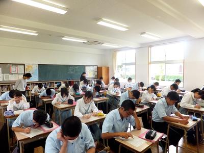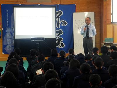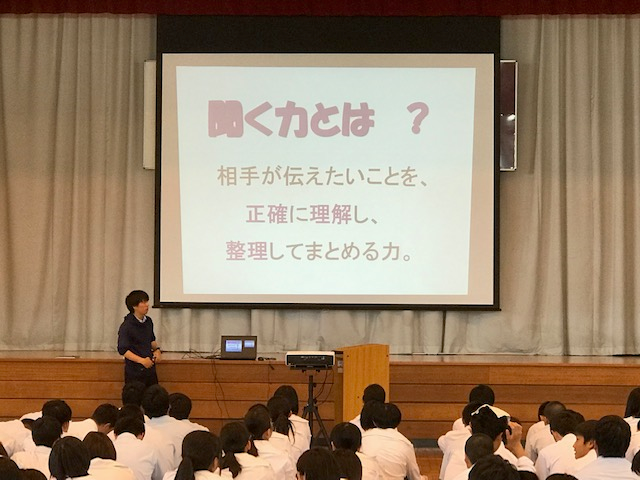 1時間目には校長講話を実施しました。これからのSociety5.0の社会を担う若者に求められる資質や能力について、また生徒たちに期待することについて、瀬口和弘校長自身がその思いを直接生徒たちに伝えました。2時間目には「生徒募集」「防災」「生徒会活動」の3つのテーマを担当する教諭から、それぞれのテーマについて、本校の現状と課題についての講話を行いました。生徒たちもそれぞれの先生方の話を真剣に聞き入っていました。