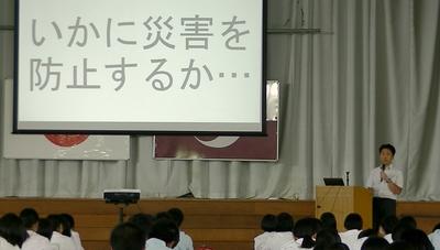 | 鹿本高校の防災の現状と課題について説明する松本弘士教諭 |