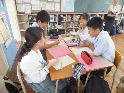 今回は、個人で考えるよりもグループで考える方が妥当性の高い解決策にたどりつけることを学ぶための「月に迷った」ゲームです。自分が乗った宇宙船が月に不時着したと仮定し、マッチ箱、濃縮された食べ物、パラシュート、100ポンドの酸素タンク、水5ガロン等のリストに重要度をランク付けしていく活動です。まず個人でランク付けした後にさらにグループで話し合い、ランク付けを見直していきます。個人よりグループで話し合った後のランク付けの方がNASAのランク付けに近くなるようです。近づかなかったグループもありましたが、何が原因で近づかなかったかについて話し合い、考えを深めてていました。