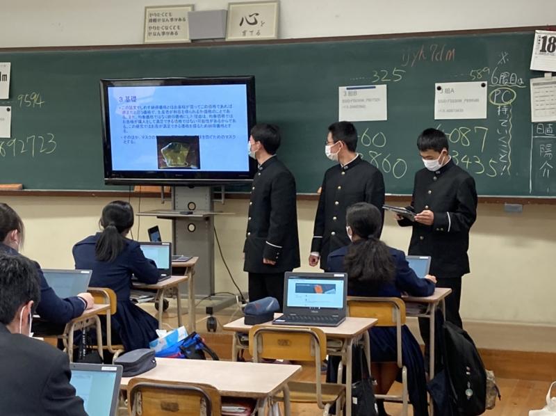 11月に行って中間報告会の評価結果や外部の教師による評価を基に2月に行われる最終発表会に向け活動を進めています。地域の医療機関にアンケートを実施したり、避難所を開設していた人吉の各事業所にインタビューしたりする班も出てきました。
