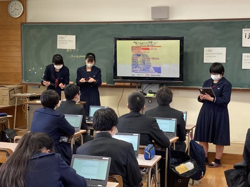 今回、評価は全員がパソコンから行い即座に集計されました。評価結果の良かった班がクラス代表として全体発表を行います。また、評価結果は全班に返され、振り返りに使います。