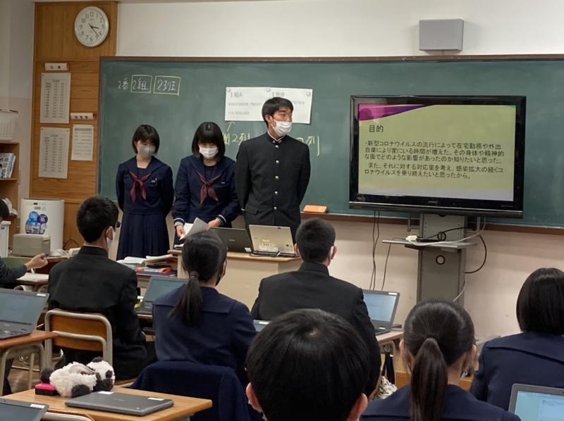 一年間取り組んできた課題研究発表会を開催しました。予選で勝ち上がった各クラスの代表5組が発表を行いました。防災に関するものやボランティア、感染症対策、などコロナ禍で見えてきたら社会課題を掘り下げ研究を進めました。