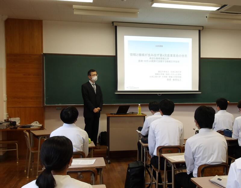 10月19日(水)、SSHの活動の一環として、受講を希望した生徒に向けた大学出前講座を行いました。講師には九州工業大学の楢原先生をお招きし、情報工学が活用され駆使されている研究開発の世界、これから広がる機会情報工学分野の新しい可能性についてお話をいただきました。