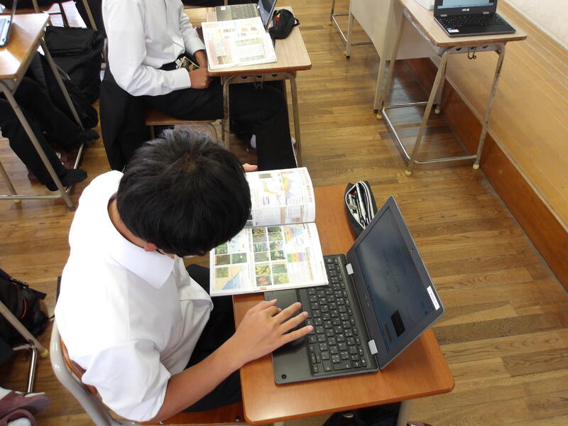 1回目となる本日は、「生態系に影響を与える人間の活動にはどのようなものがあるか」という学習課題について、書籍やインターネットを活用した情報収集・発表用スライドの作成を行いました。次回の授業でグループ内発表を行います。
