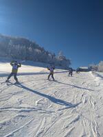午前中は、ほとんどのクラスが頂上にリフトであがり北アルプス(修学旅行⑪写真参照)を眺めながら全長約4kmのコースを多い班は3回滑走しました。