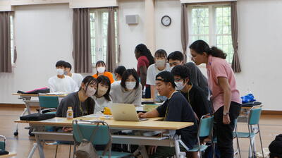 1学年のグローバルキャンプは2日目を迎え、与えられる課題も高度な内容になってきましたが、グローバルリーダー(留学生)や仲間と過ごすこの貴重な一瞬一瞬を心に刻みつけるかのように、課題に取り組んでいます。