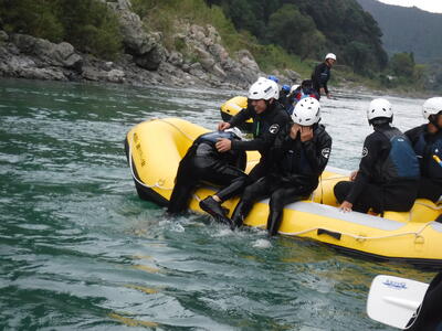 このラフティング実習には、ラフティングを経験することだけではなく、野外活動を楽しませるなどガイドとしての職業観、そして人吉で起きた「令和2年7月豪雨」から学ぶ防災教育を目的としています。