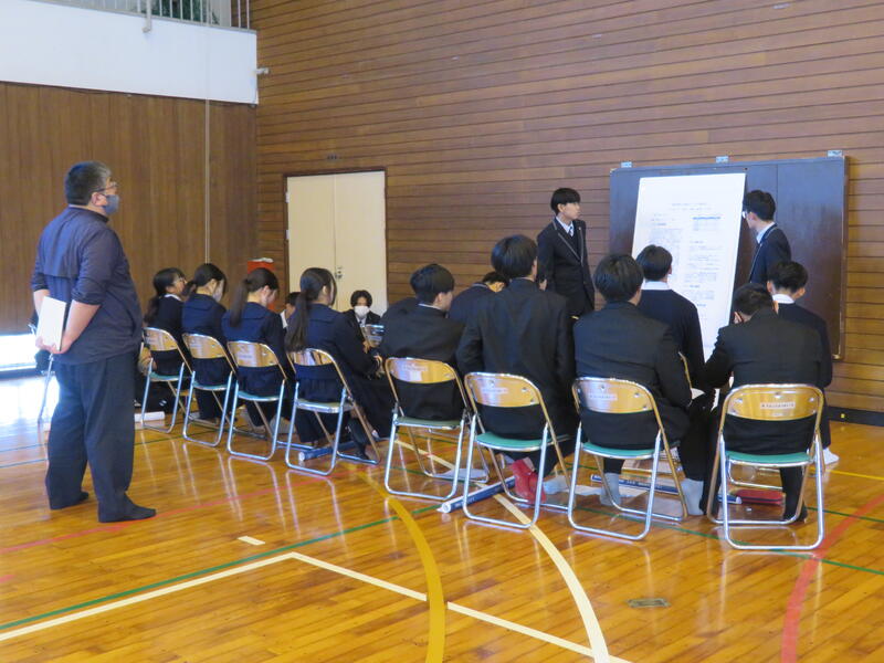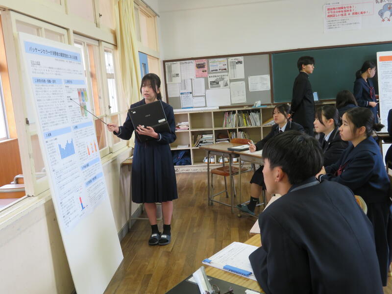 1年生が半年間かけてグループで進めてきた研究計画や、2年生が1年間かけて行ってきた課題研究の成果を披露する場として、11名の審査員の先生や近隣の小中学校、保護者の方もお呼びして行いました。