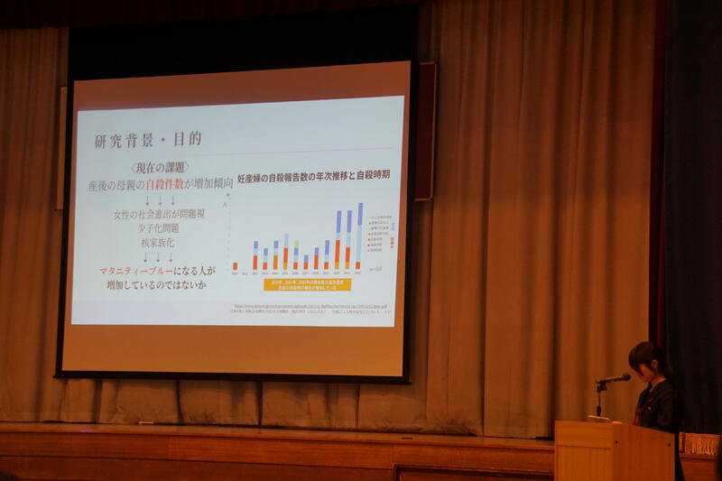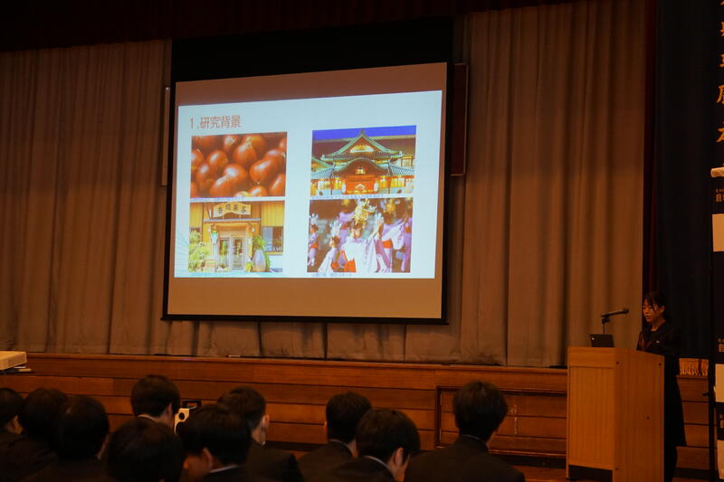 午前中の後半は1年生が発表を行いました。1年生は研究手法や計画の立て方等を秋ごろまで学び、秋からグループに分かれて学びを生かしながら研究計画まで立てる練習を行ってきました。初めての発表会で先輩の姿から姿勢を学び、先輩や友人のアドバイスから内容の深め方を学び、2年生になってからの研究に生かしていくことが狙いです。