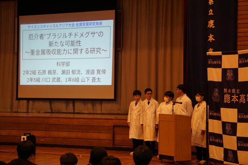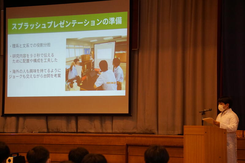 午後は、2年生の6分野の代表8名と、特別講演として「サイエンスキャッスルアジア大会」にて金賞を受賞した科学部4名による計7研究の発表会を行いました。