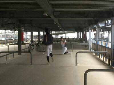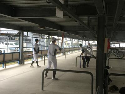 2月27日(金)は、卒業式の関係で代休です。朝から練習でしたが、雨でグラウンドが使用できず、今日は駐輪場の一部を借りてのスイング練習です。