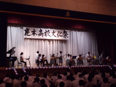 本校顧問の先生は学生時代に先生に就いてギターを勉強され、毎日、生徒と一緒に練習、指導されており、部員たちも楽しく活動しています。山鹿市図書館や保育園、商店街などへも招かれ、「鹿本高校ギター・マンドリン部」をアピールしています。またエレキギターや打楽器をも加え、新入部員を勧誘して伝統を繋いでいけるように活動を続けていきたいと思っています。きれいな音色で人の心を和ませられる演奏ができるよう心がけています。