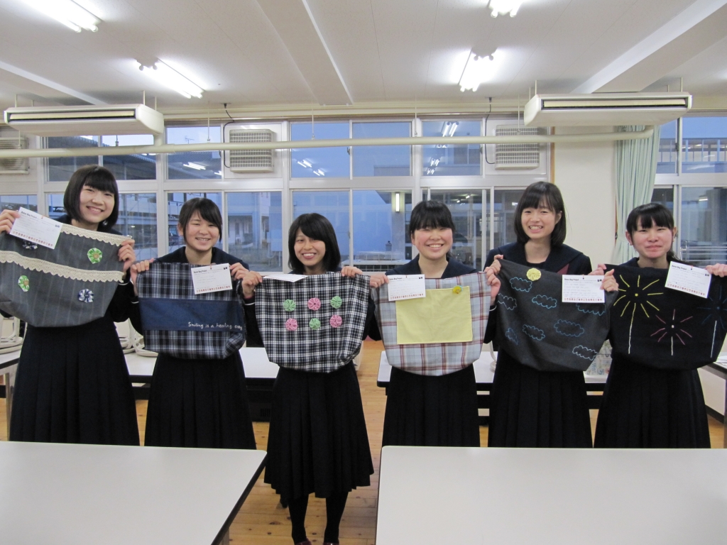 部員は2年生6名で週1回活動しています。私たちは文化祭で地元の食材を使ったお菓子の販売に取り組み、食の知識や技術を高めています。それからソロモン諸島の貧しい子供たちに、捨てられる生地を用いたバックを送る活動に参加しました。また、最近は食物調理技術検定2級に挑戦しています。食品群別摂取量を考えて献立作成を行い、制限時間内に調理ができるように練習に励んでいます。