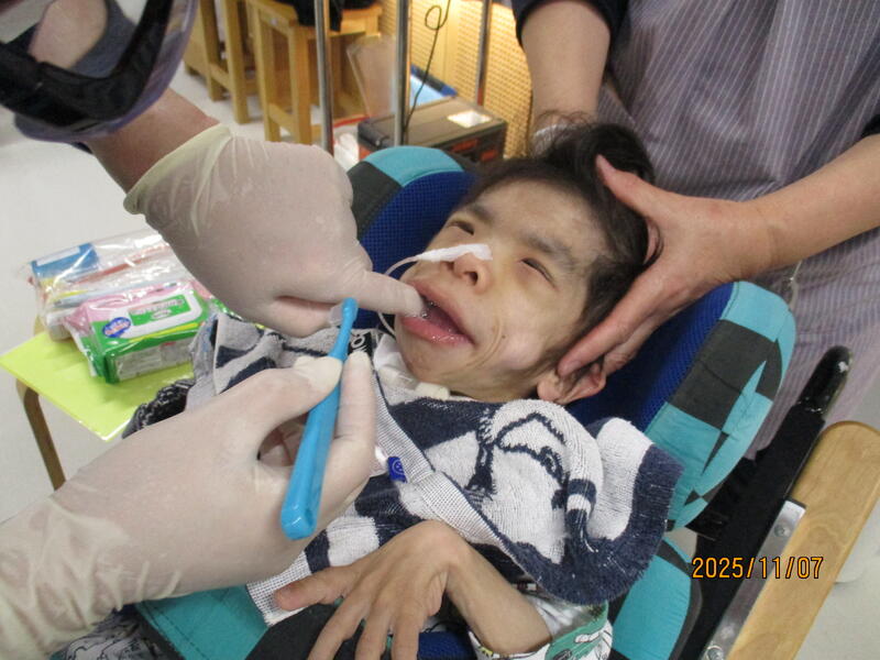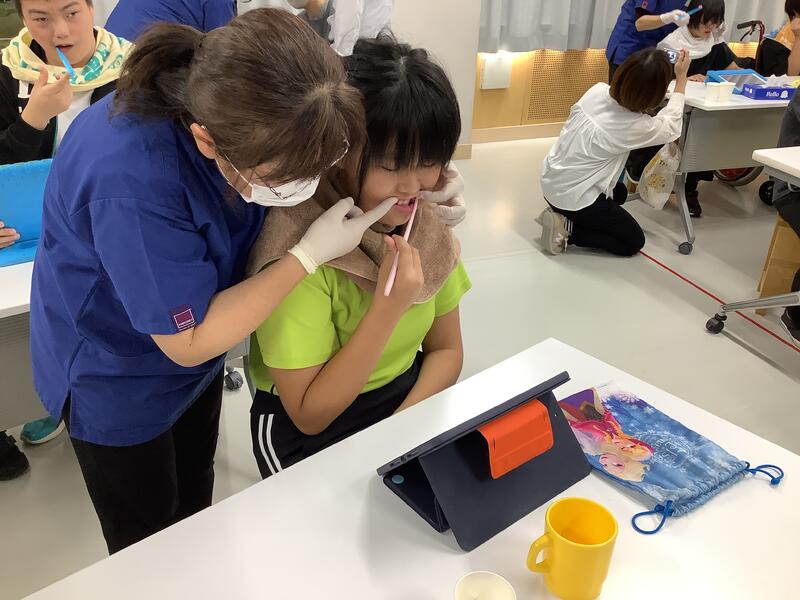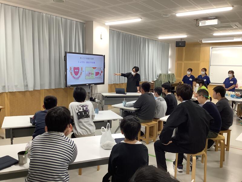 11月7日(金)に神山歯科の神山敬先生、歯科衛生士の方々に来ていただき、歯みがき教室を実施しました。染め出し液を使い、自分のみがき残しに気付いたうえで、歯ブラシの当て方やフロスの使い方を教えてもらい、丁寧にみがき上げることができました。また、「あいうべ体操」が口の健康につながることも分かり、毎日の歯みがきと合わせて、継続して取り組んでいきたいと思います。神山歯科の先生方、ありがとうございました!
