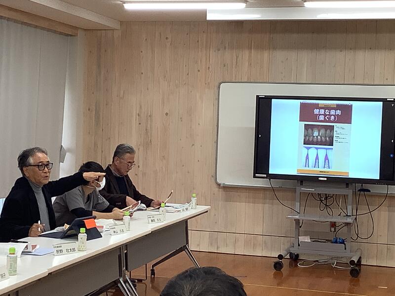 学校からは、日頃行っているフッ化物洗口の様子や、歯みがき指導、学校歯科医による歯みがき教室、保健委員会による歯と口の健康についての取組などについて説明しました。保護者からは、幼少期からの仕上げ磨きなどホームケアの工夫、歯科受診に向けて歯科医等への相談など、各家庭での様子や工夫をお話していただきました。学校医からは、口呼吸が口腔内環境に及ぼす影響などについて専門的立場からの助言をいただきました。また、学校歯科医からは、むし歯や歯周病の予防についてお話をしていただき、歯みがきの方法やフッ化物入りの歯磨き粉や歯間ブラシの使用についてお話されました。