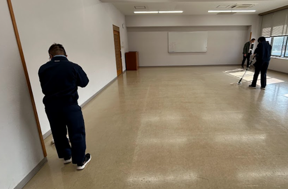 普段の作業学習で学んでいるあいさつや役割分担、道具の扱い方などを意識しながら、床の掃き掃除や拭き掃除に取り組みました。