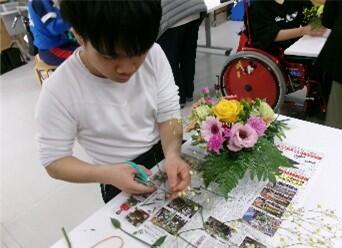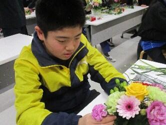 1月13日、熊本県花き協会の方を講師としてお招きし、中学部で「フラワーアレンジメント教室」を行いました。バラやカーネーションなどたくさんのかわいい花に興味津々の生徒達。講師の方に花の種類や扱い方について丁寧に教えていただきながら、作品づくりに取り組みました。色合いや配置を工夫しそれぞれ思い思いに活動する姿が印象的でした。