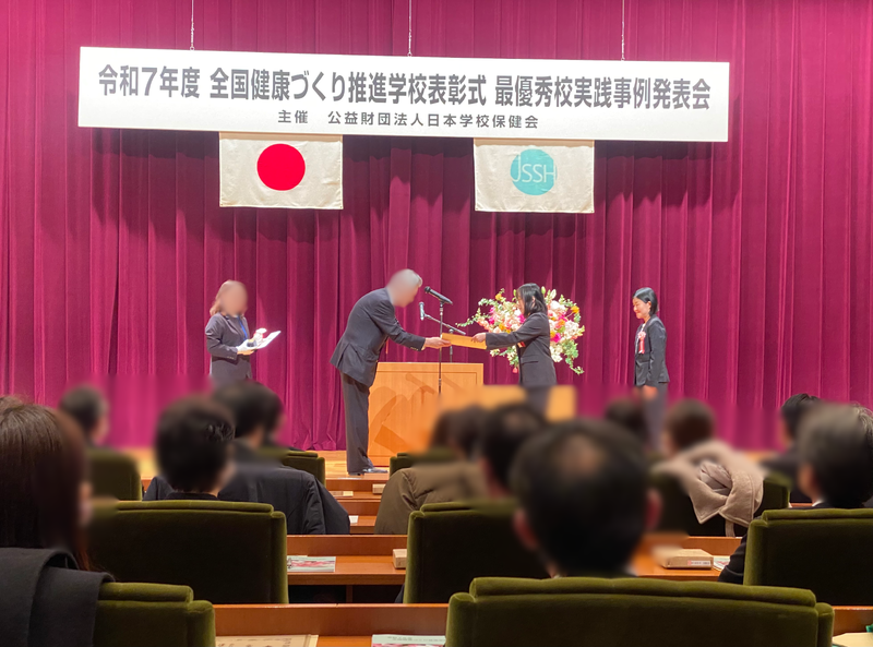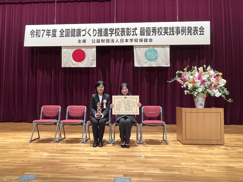 令和7年度全国健康づくり推進学校表彰事業(主催 公益財団法人日本学校保健会)において、「心身共に健康で未来を切り拓く児童生徒の育成~家庭・地域と共に、ゆっくりたっぷり一歩ずつ歩む健康づくり~」をテーマに取り組み、最優秀校を受賞しました。