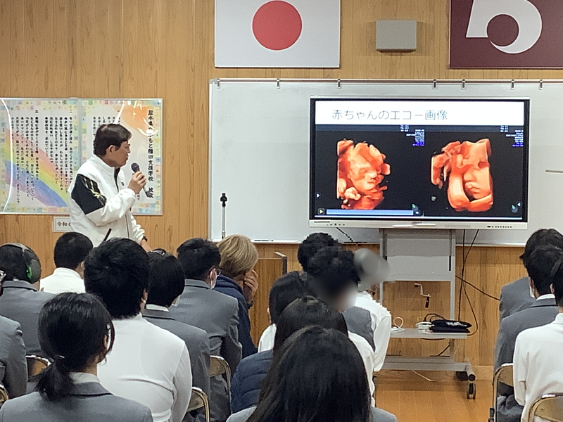 講話では、1.性感染症及び妊娠出産につながる性行為とは 2.望まない妊娠を避けるための避妊方法 3.産婦人科医からみる妊娠とサポートする男性の役割について、大きく3つの内容についてお話されました。性感染症や妊娠出産等について、赤ちゃんのエコー写真や動画を示され、科学的根拠を踏まえて、生徒にわかりやすくお話されました。赤ちゃんの発達や機能、体内での胎児の様子について詳しく話され、「えぇ~!」「もう人間の顔だ」などの驚きの声も上げつつ、松尾先生のお話に聞き入っていました。