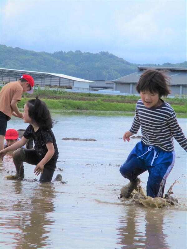 今年度も稲作アドバイザー平本さんの御協力により、子どもたちも毎年楽しみにしている恒例のイベントである代搔きや田植えを、無事に行うことができました。代搔きは、田植えの前に水と泥を混ぜ、雑草を防いだり田んぼをやわらかくしたりするための作業です。子どもたちは自由に走り回り、全身どろんこに。また、フラッグレースも全力で走りました。