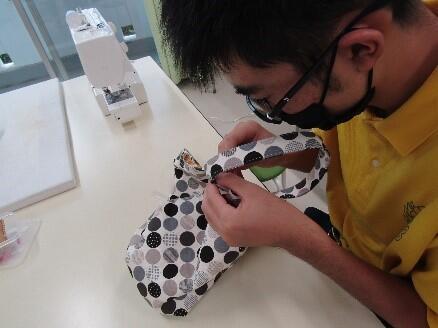 クラフト班では1学期に布製品を作るための基礎的な練習を行い、2学期から製品を作り始めました。トートバッグやポケットティッシュケースを作っています。たくさん販売できるよう頑張っています。