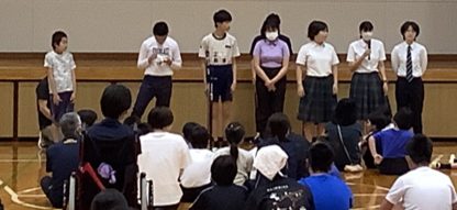 【全校集会 児童生徒会役員の自己紹介の様子】