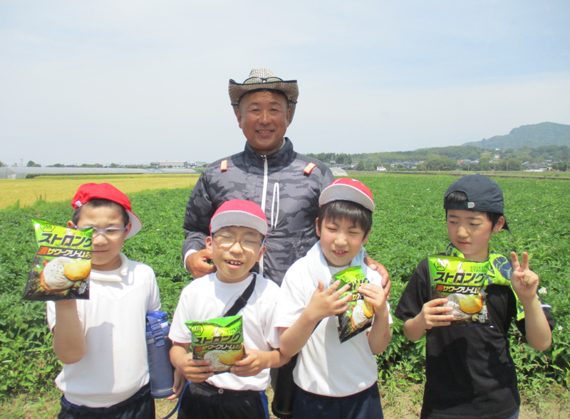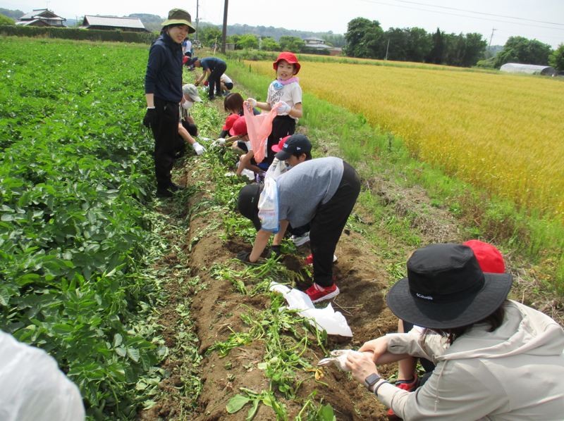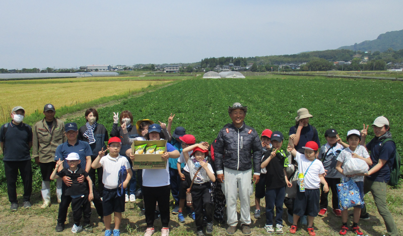 5月15日(木)に、昨年度に引き続き、農業組合法人立山農産の立山さんのジャガイモ畑で収穫体験をさせていただきました。子どもたちは1年前のジャガイモ掘りの体験をしっかり覚えており、「楽しみだな~!」「今年もいっぱい掘るぞ!」とやる気満々。嬉しそうな表情で、ジャガイモ畑へ出発しました。