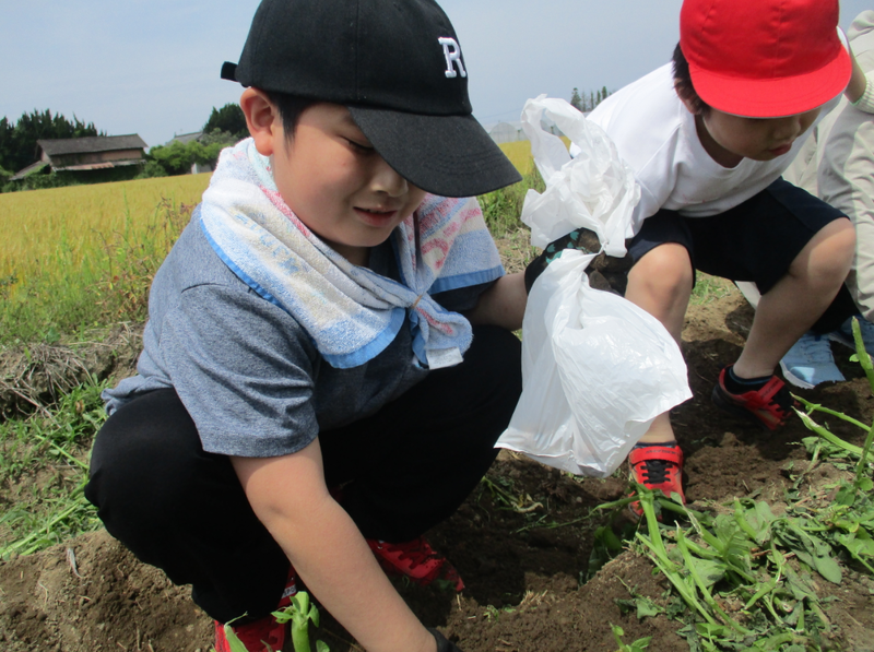 畑では、ジャガイモの形に注目し、「二つひっついているジャガイモがあったよ!」「大きいジャガイモがあったよ。」と、様々な発見をしながら掘っていました。汗びっしょりになりながら収穫し、「お母さんに持って帰る!」と満足げな表情をしていました。