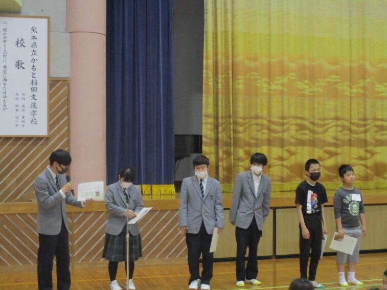 4月26日(金)に全校集会がありました。 児童生徒会から「役員紹介」や「年間行事予定」「いじめ防止」について話がありました。「いじめ防止」については、「嫌なことがあったり、きついことがあったりしたときは、周りの大人に相談しましょう」と呼びかけました。各学部に情報集約担当者(小学部は日隠先生、中学部は後藤先生、高等部は中満先生)がいますので、一人で悩まずに話してください。