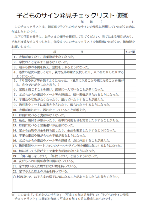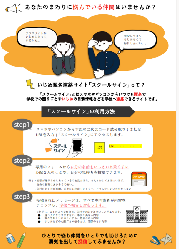 | 今年度も、子どものサイン発見チェックリストや相談窓口一覧の配布、スクールサインの登録等を行い、自分に合った方法でSOSが出せるようにしていきます。 |