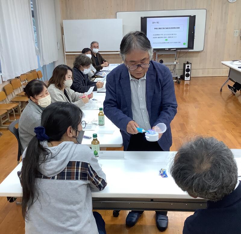学校からは、日頃取り組んでいる給食時間での指導や、運動習慣を身に付けるための工夫、個々に合わせた指導などについて説明しました。保護者からは、できるだけ間食する時間を作らないよう工夫している、あえて遠くの駐車場に停めて歩くようにしている、家族と一緒に散歩を続けているなど、各家庭での実践を話していただきました。学校医からは、いびきの原因や対処方法、体重管理の工夫などについて専門的立場からの助言をいただきました。学校歯科医からは、むし歯や歯周病の予防として、歯みがきが重要であり、超音波の電動歯ブラシも有効であると話されました。