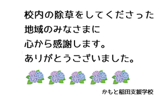 梅雨は気温の上昇と雨の影響もあって、ぐんぐんと草木が伸びてしまい、本校の学校技師が毎日刈り払い機を使って除草を行っていますが、広い校庭の草の勢いがとどまることがありません。そんな中、先日の県下一斉クリーン作戦(地域の清掃活動)の折、本校の敷地内を除草してくださった方がいらっしゃいました。除草が追い付いていない状況を見かねて、公道だけでなく学校敷地内に入ってくださったものだと思います。翌日、除草されている校庭を見た職員が驚いて報告していましたが、地域の皆さまのご厚意に心から感謝しているところです。本当にありがとうございました。児童生徒が在校中は門扉を閉めておりますが、放課後や休日は地域の方々へ校庭を開放させていただいております。どうぞ、地域の施設としてご利用ください。