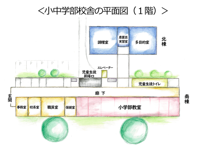 校舎1階の平面図です。1階には、小学部の教室と、重複障がい学級の教室が入ります。