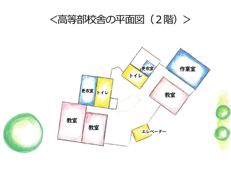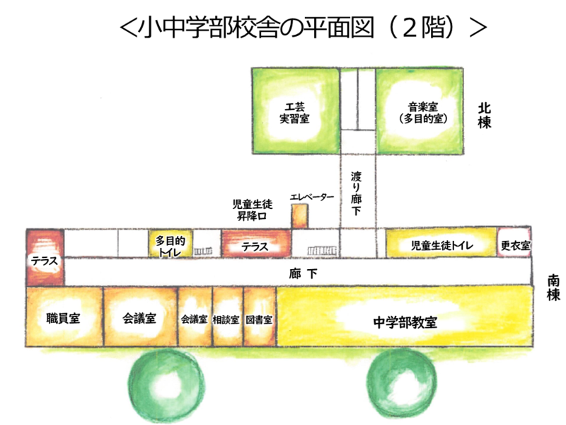校舎2階の平面図です。2階には中学部教室が入ります。階段やエレベーターで上がることができます。職員室は1階、2階のそれぞれにあります。