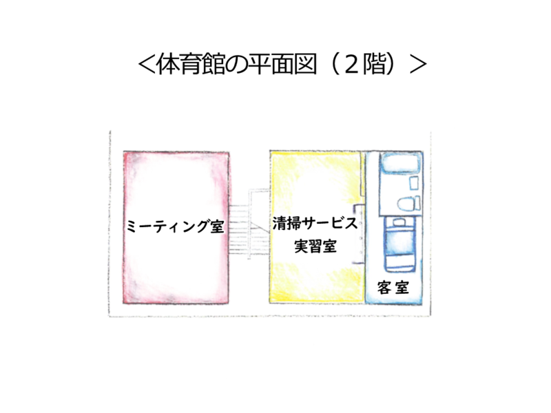体育館2階には、ミーティング室や清掃サービス実習室を整備し、実習で使うことができます。