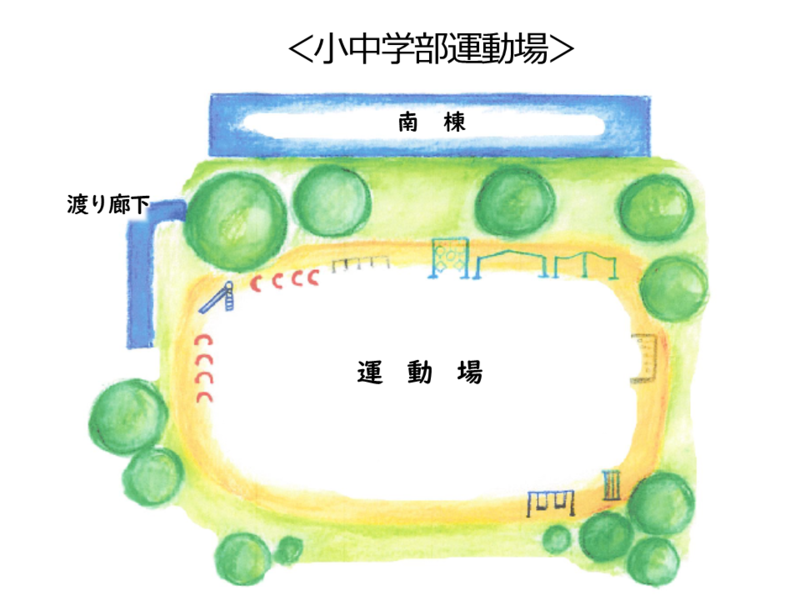 校舎は南棟と北棟で構成されます。校舎北側には体育館、南側には運動場があります。また、道路をはさんで向かい側に、プールがあります。エントランスにはロータリーが設置され、登下校がしやすくなります。